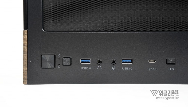 외부 연결성도 뛰어나다. 케이스 상단에는 USB-A형 단자와 USB-C형 단자, 스테레오 입출력 단자 등 다양한 외부 연결 인터페이스를 제공한다. 기본적으로 USB-3.2 Gen1(A형) 단자 2개와 USB 3.2 Gen2x2(C형) 1개가 제공된다. USB-C형 단자는 최대 20Gbps 전송이 가능한 규격이어서 외장 SSD나 고속 전송장치 사용에 유리하다. 기본적인 전원, 리셋 버튼 외에도 LED 점등 상태를 바꾸는 버튼도 제공해 취향에 따른 PC 분위기 연출이 가능하다.