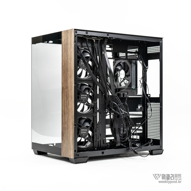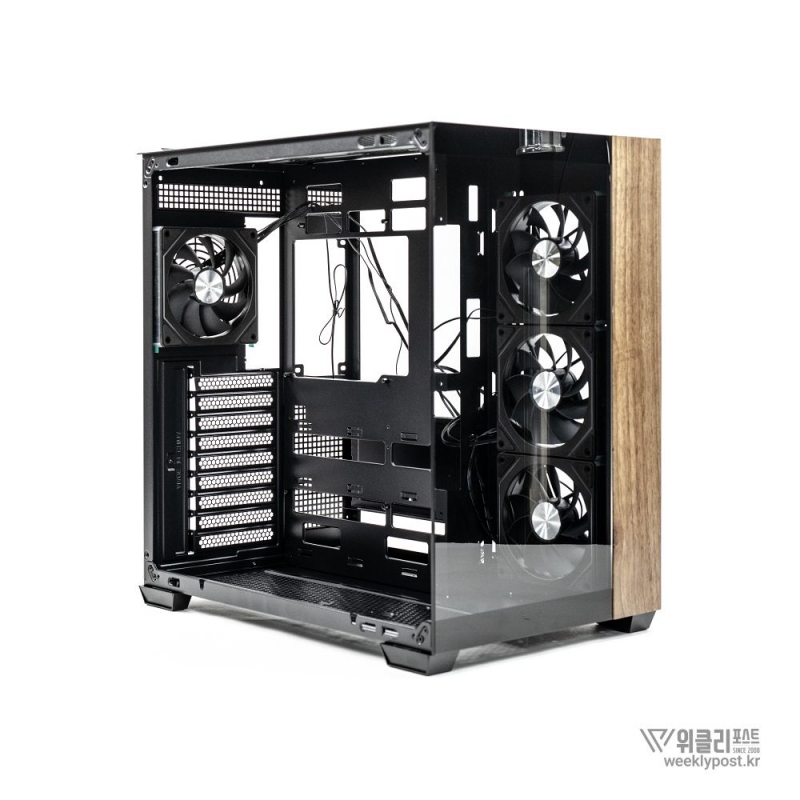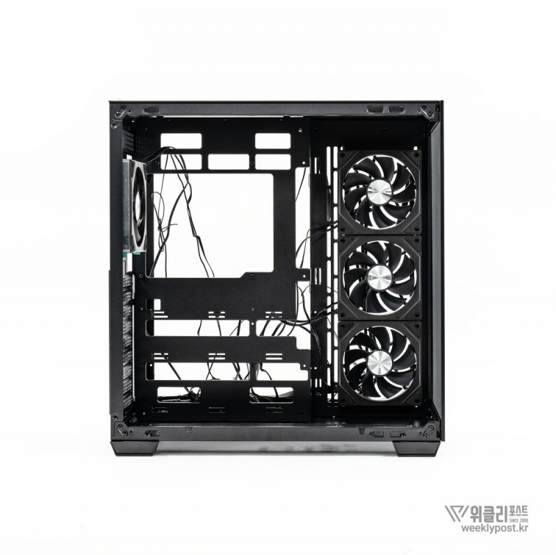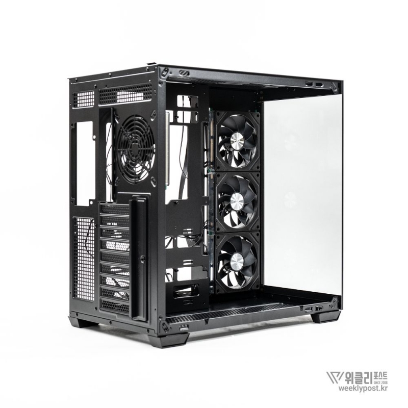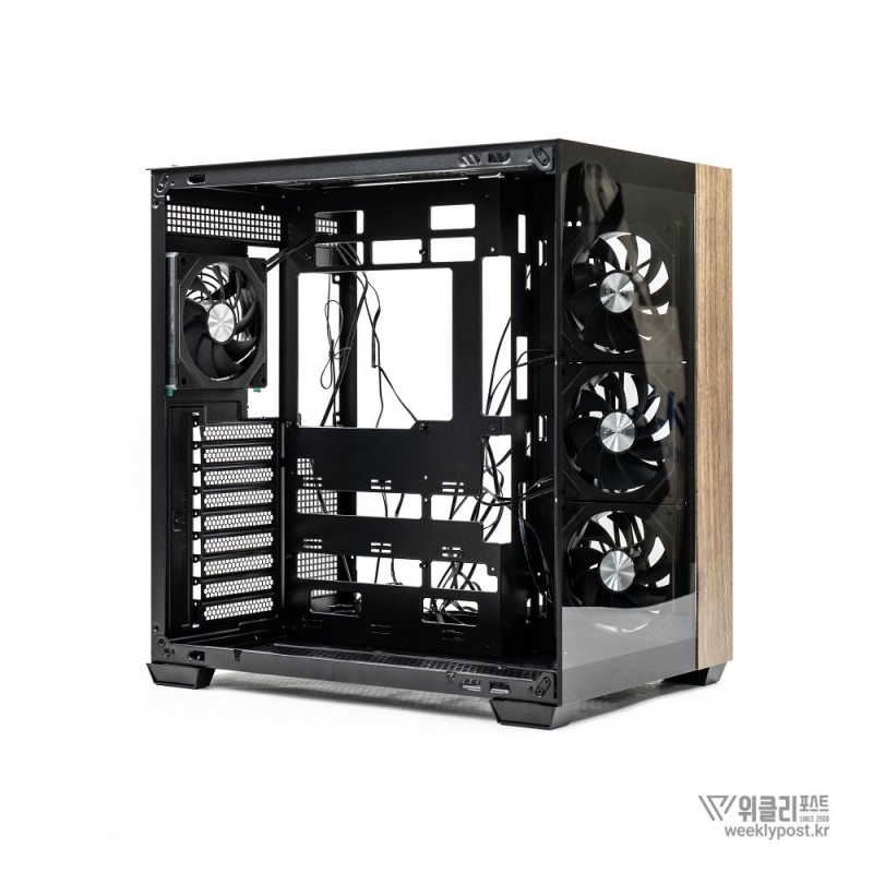 측면은 강화유리 패널로 완전히 개방되어 있다. ‘풀 파노라믹 디스플레이(Full Panoramic Display)’라 명명된 디자인을 통해 시스템 내부를 자유롭게 감상 가능하다. 따라서 LED 혹은 LCD가 적용된 PC 부품을 장착한다면 효과가 더 두드러진다.