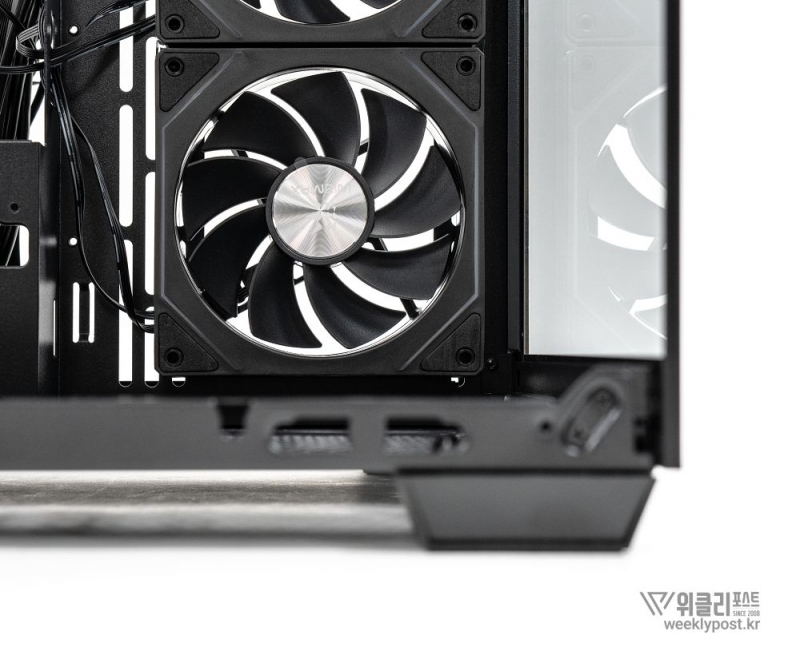 측면, 상단, 하단에 각각 최대 360mm 규격의 일체형 수랭식 쿨러 배치가 가능한 점도 눈에 띄는 부분이다. 사용자가 원하는 위치에 고성능 냉각 장치 설치가 가능하도록 배려한 것이다. 일체형 수랭식 쿨러가 장착되지 않은 부분에는 별도로 120mm 냉각팬 설치가 가능하다. 360mm 일체형 수랭식 쿨러를 1개 배치했을 경우, 최대 7개에 달하는 120mm 냉각팬 설치를 지원한다. 제품에는 aRGB 및 PWM 기능이 포함된 120mm 냉각팬 4개가 기본 장착되어 있다. 취향에 따라 상단과 측면에 최대 140mm 냉각팬 2개 장착이 가능하다.