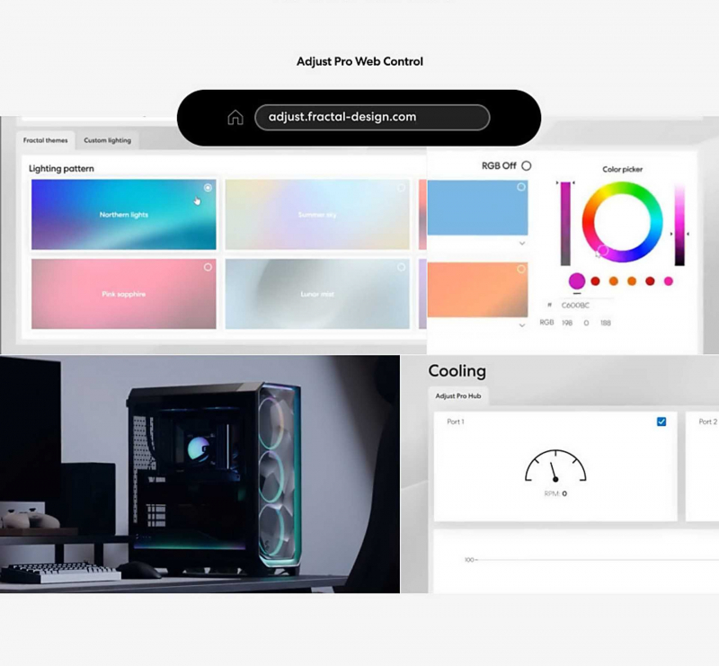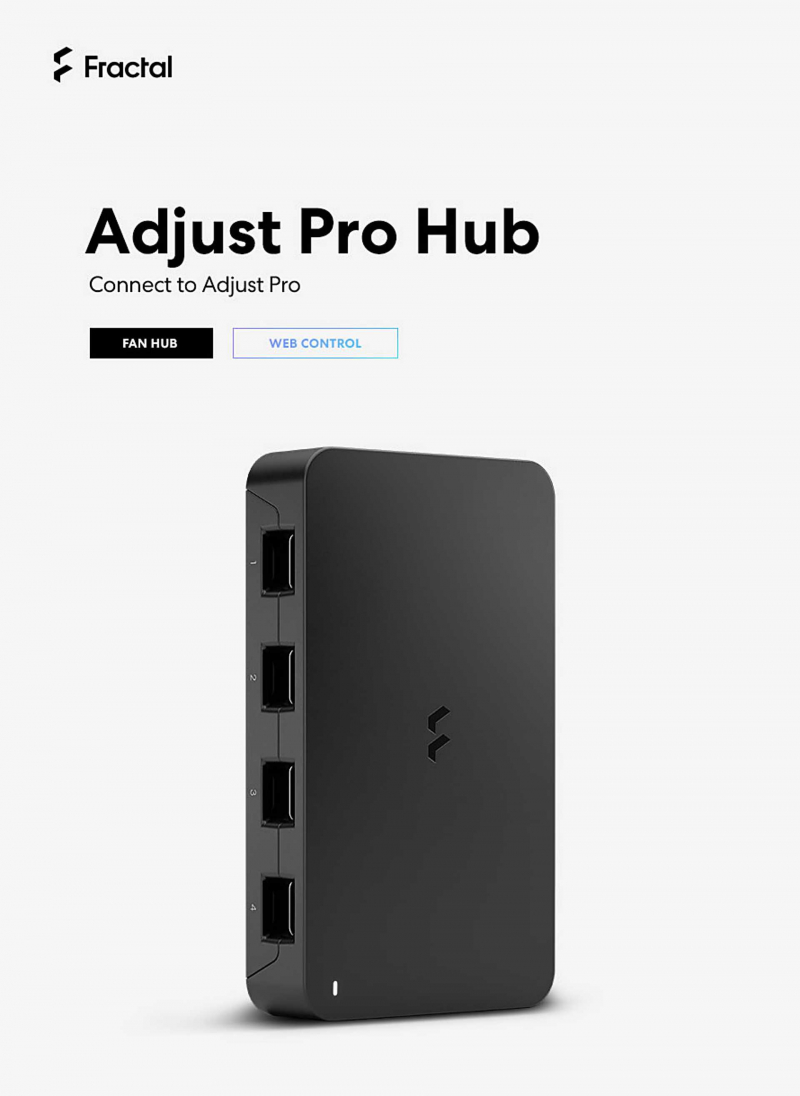 어드저스트 프로 허브는 프렉탈디자인 모멘텀 쿨링팬 시리즈와의 통합 제어를 지원하는 팬·조명 컨트롤러로, 메쉬파이 3 앰비언스 프로 케이스에 기본 탑재된 구성과 동일한 형태다. 별도 구성에서 모멘텀 쿨링팬을 개별 구매한 사용자를 위한 독립형 액세서리로 출시됐다.
