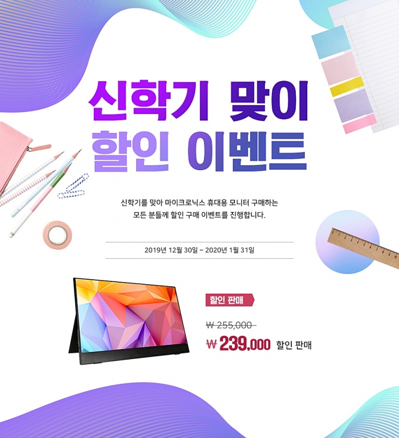 때마침 컴퓨터기기 전문기업 한미마이크로닉스가 작업 편의를 두 배로 늘려주는 F156-FT 포터블 모니터를 신학기 맞이 할인 판매한다. 내년 1월 31일까지 정가 25만 5,000원에서 할인 해 23만 9,000원(무료배송)에 구매할 수 있다.