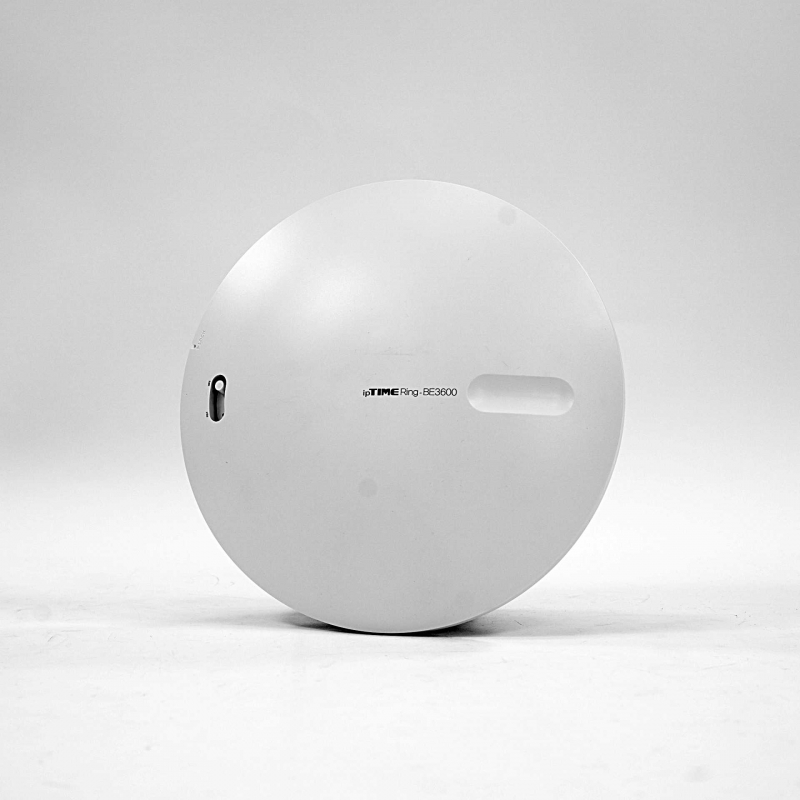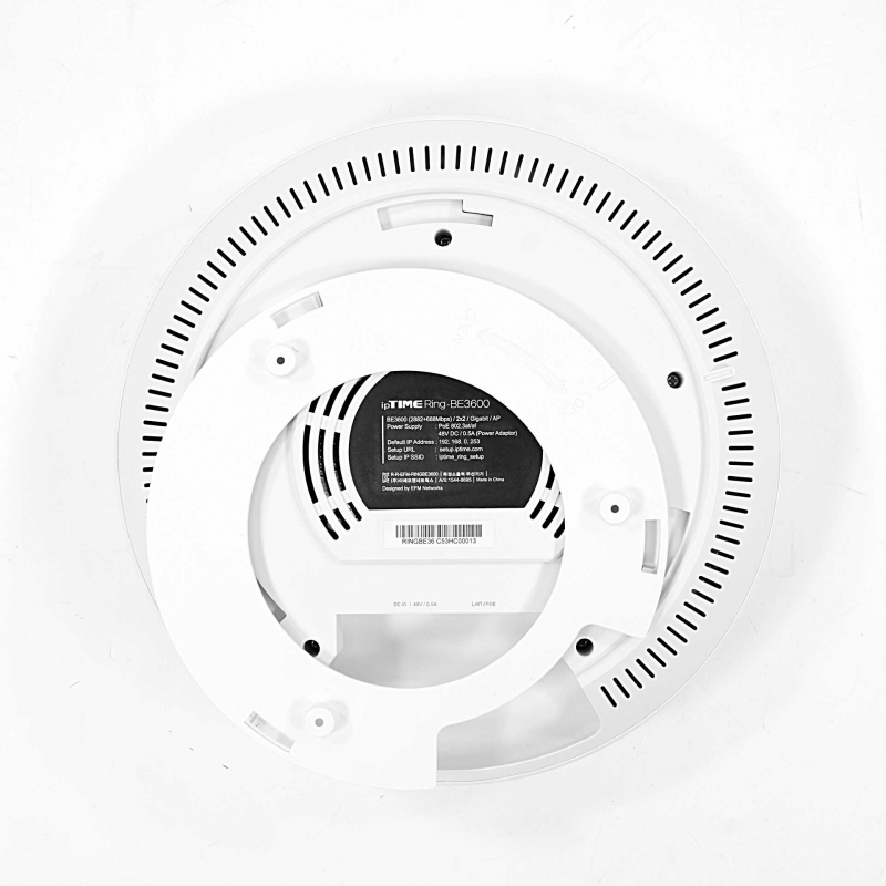 아이피타임 Ring-BE3600의 외형은 기존 공유기나 확장기와는 완전히 다르다. 일반적인 안테나 외장형이 아닌, 원형 플랫 구조로 마치 연기 감지기처럼 생긴 것이 특징이다. 이는 단지 미관을 위한 설계가 아니라, 실제 벽면이나 천장에 부착했을 때 외관을 해치지 않으면서도 전파를 넓게 고르게 확산시키기 위한 구조적 디자인이다.
