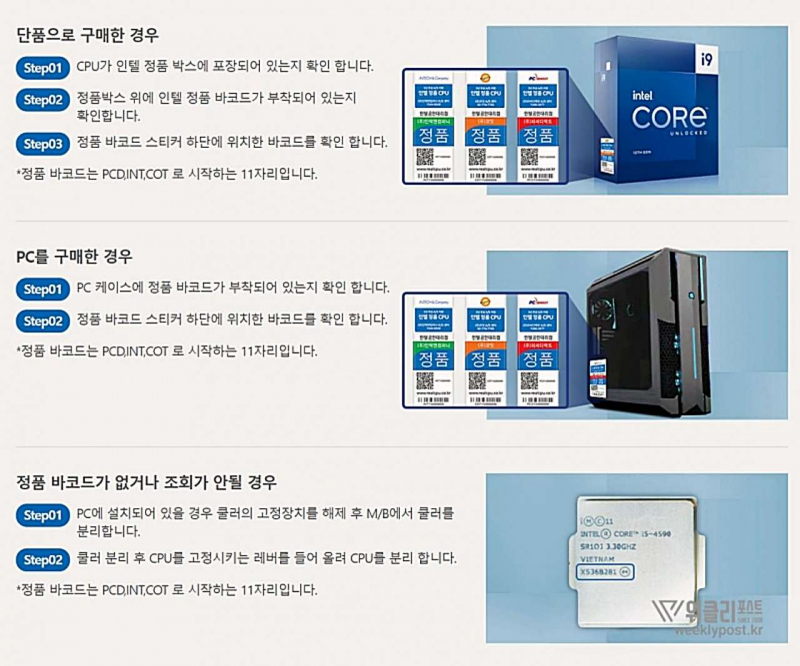 취재 중 가장 많이 들었던 경고는 “정품 여부를 꼭 확인하라”는 것이었다. 병행수입 제품이나 벌크 CPU는 불량이 나도 국내 서비스가 불가능하다. 커뮤니티에는 해외직구 CPU 문제로 말레이시아 글로벌 센터에 보냈다가 한 달 넘게 기다렸다는 사연이 한번씩 등장한다. 혹은 벌크 CPU를 중고로 샀다가, 개인은 A/S 대상이 아니란 사실을 뒤늦게 알았다는 사연도 있다.