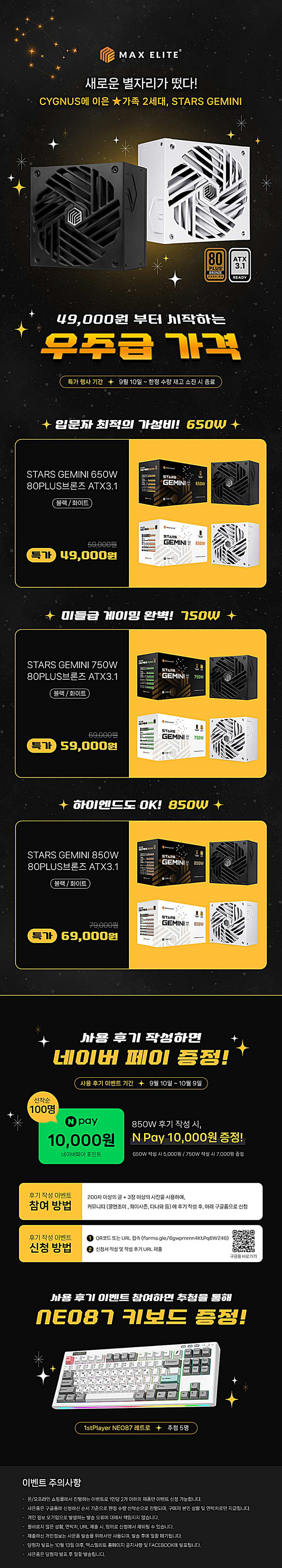 맥스엘리트는 신제품 출시를 기념해 650W, 750W, 850W 모델을 한정 수량 특가(49,000원~69,000원)에 판매한다. 후기 작성 고객에게는 네이버페이 포인트(최대 1만 원)를 증정하고, 추첨을 통해 NEO87 유무선 기계식 키보드를 제공한다. 이벤트는 9월 10일부터 10월 9일까지 진행되며, 당첨자는 10월 13일 이후 홈페이지와 페이스북에서 발표된다.