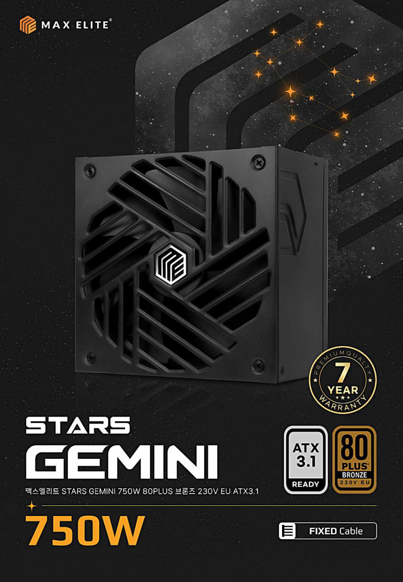 맥스엘리트가 최신 ATX 3.1 규격을 지원하는 STARS GEMINI 80PLUS 브론즈 파워서플라이를 출시했다. 650W·750W·850W 모델로 구성되며 블랙과 화이트 색상 옵션을 제공한다. 런칭 기념 특가와 함께 후기 이벤트로 네이버페이와 기계식 키보드를 증정한다.