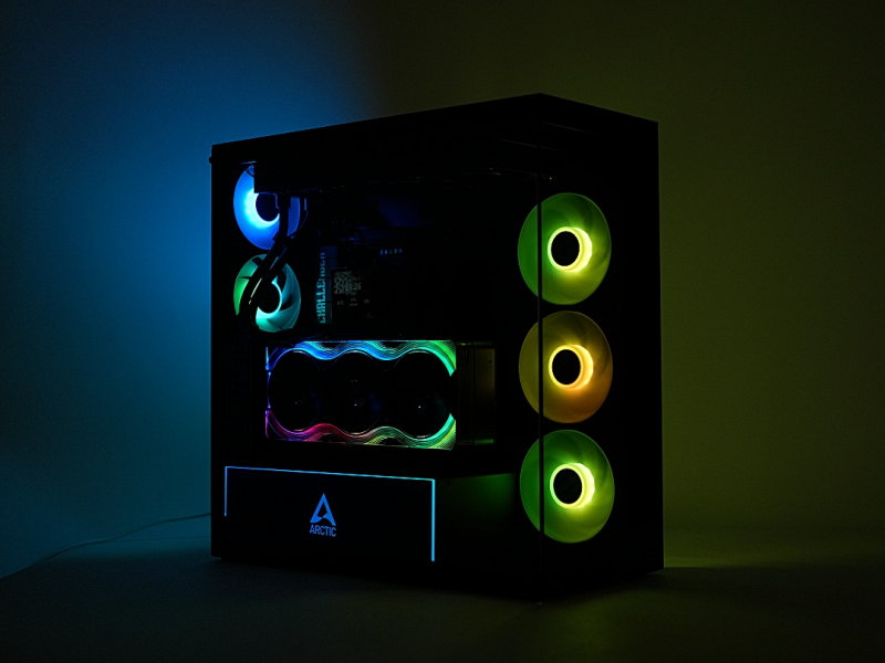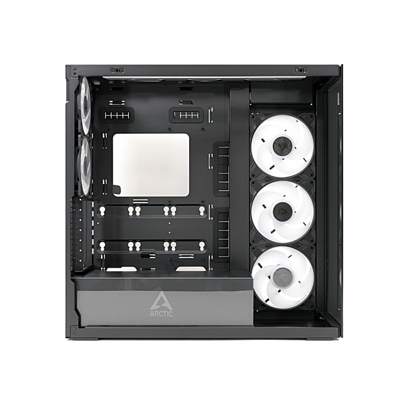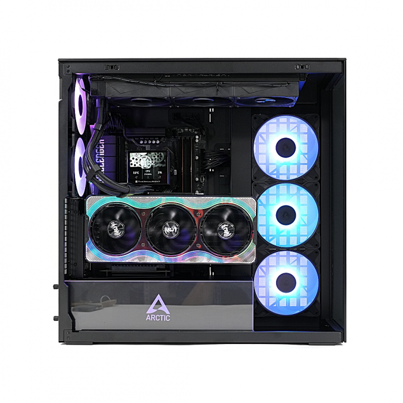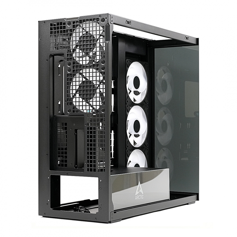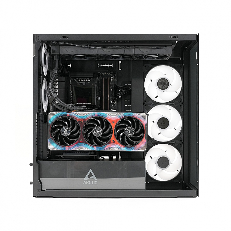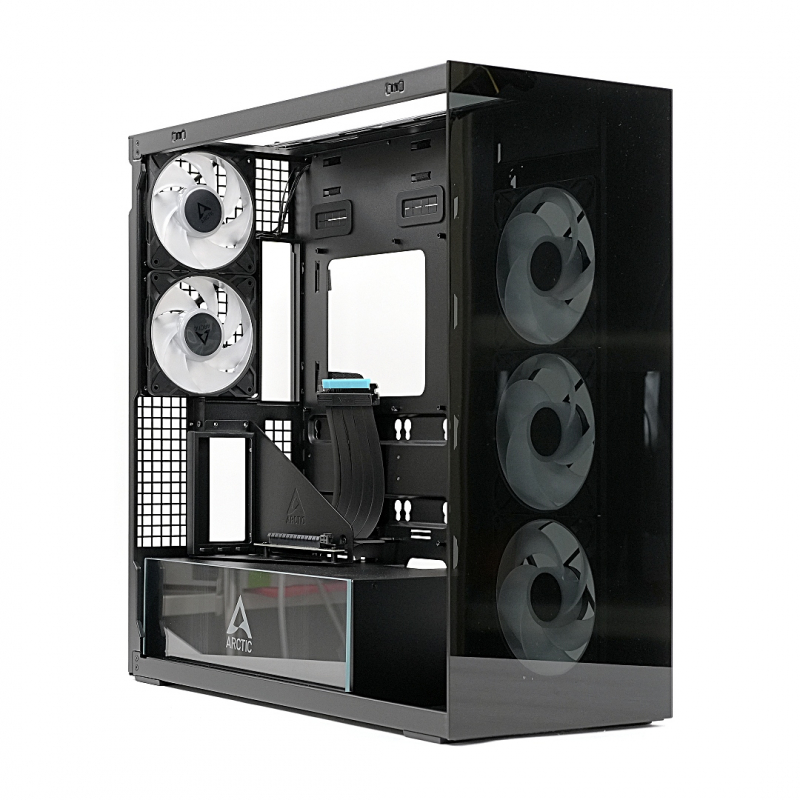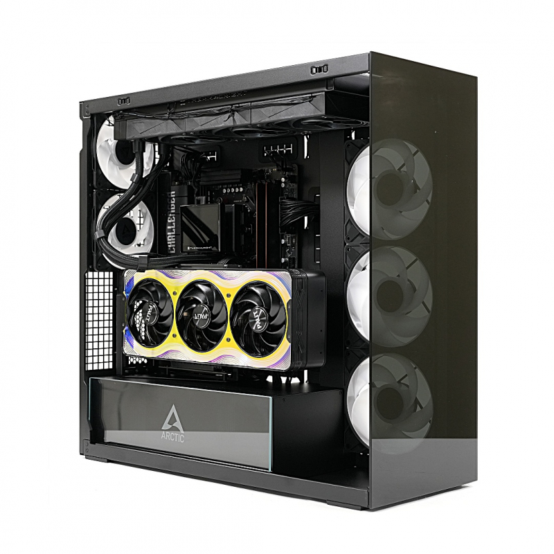 "ARCTIC 엑스텐더 VG는 빅타워급 성능을 지닌 미들타워 케이스다. 최대 420mm 라디에이터 2개, 8개 팬, 대형 메쉬 패널과 먼지 필터를 갖춰 강력한 쿨링 환경을 제공한다. 파워 서플라이를 20mm 높여 공기 흐름을 극대화했고, 기본 장착된 P12·P14 프로 팬은 고풍량·고정압 성능을 자랑한다. 디자인은 큼직하고 RGB가 화려하며, 케이블 스트랩과 3D 패스스루 덕분에 선정리도 쉽다. 안전한 선택지이면서도 디테일을 살려 완성도를 높인 케이스로, 고성능 시스템 구축에 적합하다."