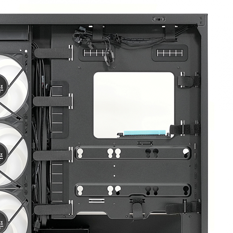 엑스텐더 VG의 배선 동선은 직관적이다. 중간중간 케이블 스트랩이 있는데, 이 스트랩만 따라가며 선을 모아주면 된다. 그러면 자연스럽게 선이 깨끗하게 정리된다. 3D 케이블 패스스루만 봐도 깔끔하고 각이 딱 잡혀 있다. 메인보드 뒤쪽으로 케이블을 뺄 때도 정리하기 쉽다.