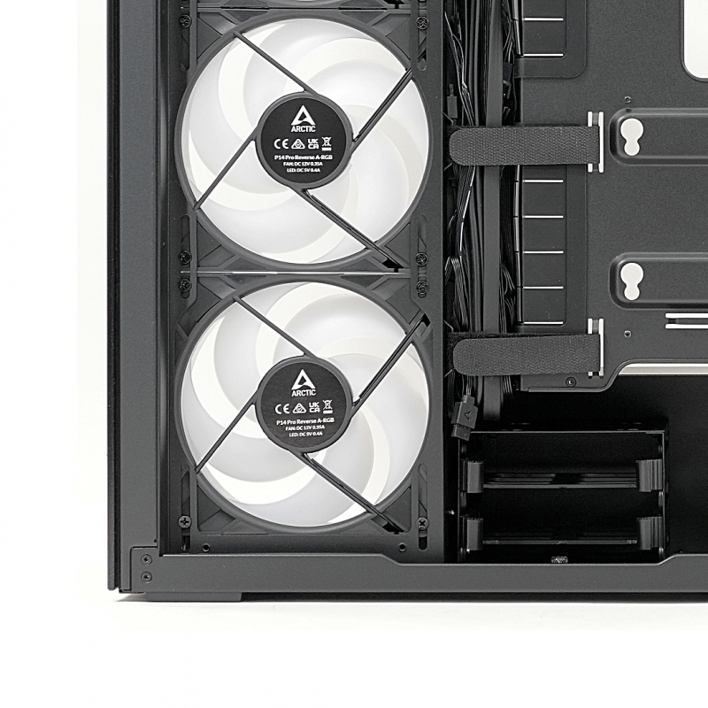 쿨링팬은 두 가지로 나뉜다. 측면에 붙어 공기를 흡입하는 P14 Pro Reverse A-RGB Fan x3, 후면에서 공기를 내보내는 P12 Pro A-RGB Fan x2 구성이다. 제품명에서 알 수 있듯 P14 Pro Reverse A-RGB Fan은 140mm, P12 Pro A-RGB Fan은 120mm 규격이다.