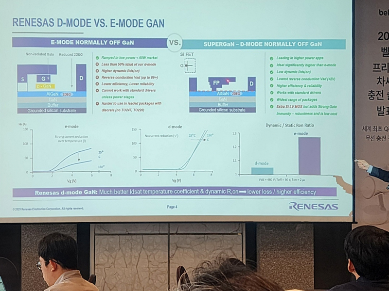무게있게 다뤄진 대목은 GaN 스위칭 구조의 차이였다. 르네사스 일렉트로닉스 측 발표에 따르면, 기존 E-모드(E-mode) GaN은 구조적으로 P-갭(양공 경로)을 쓰는 탓에 고주파 스위칭 시 전자 포획에 따른 저항 증가(Reverse Recovery 비유)가 발생, 스위칭 손실이 커질 수 있다는 지적이 나왔다. 반면 D-모드(D-mode) GaN은 해당 경로가 없어 주파수가 올라가도 온저항 상승이 억제되고, 결과적으로 전력 손실이 E-모드 대비 3~4배 낮다는 수치가 제시됐다. 하지만 르네사스의 ‘3~4배 낮은 손실’ 근거는 테스트 주파수·부하·온도가 관건이다. 제3자 인증 데이터가 필요한 부분이다.
