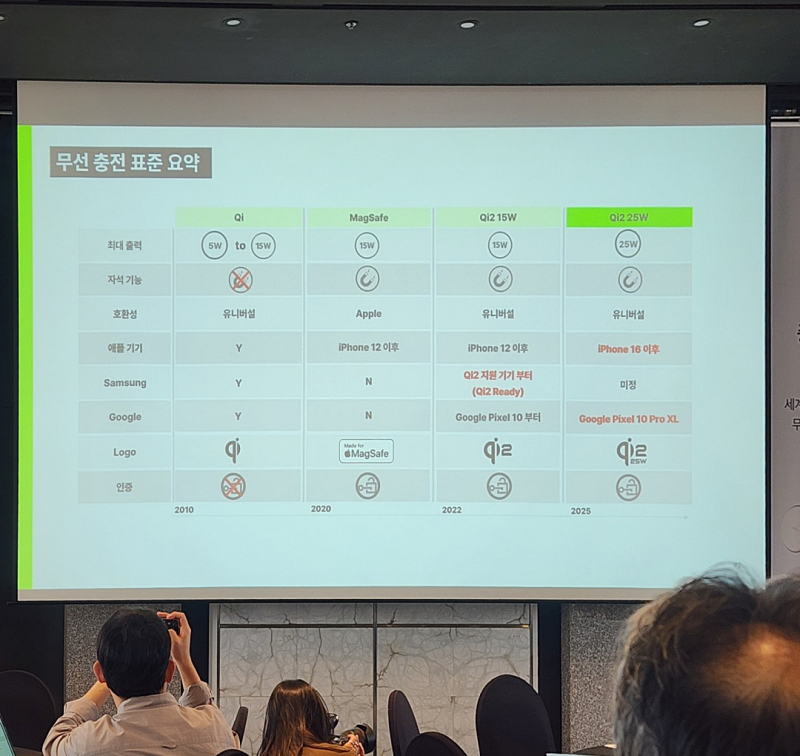 프레젠테이션에서 벨킨은 iOS 26 업데이트 적용 시 아이폰 16·16 Pro 20W, 16 Plus·16 Pro Max 25W까지 Qi2 충전을 지원한다고 정리했다. 아이폰 17 시리즈는 25W 기본 지원으로 안내됐다. 안드로이드 측에선 픽셀 10/10 Pro가 20W급 Qi2 지원의 첫 주자로 거론됐다. 삼성은 ‘Qi2 Ready’로 로고 가이드를 별도 운영하며, 케이스 인증 유무에 따라 실제 충전 속도가 5~15W로 갈린다는 경고를 회사는 재차 강조했다.