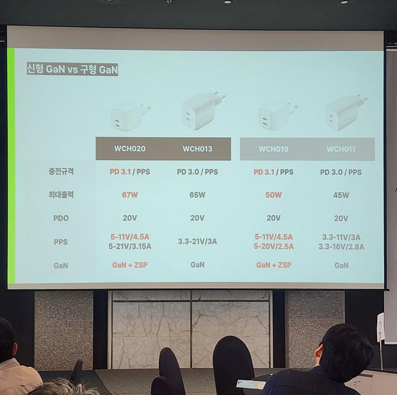 벨킨은 트래블 콘셉트 3포트 GaN 어댑터(싱글 70W/100W, 총합 70W/100W)도 공개했다. PD 3.1·PPS를 지원해 애플·삼성 고속 충전이 가능하다는 설명이다. 제로 스탠바이 파워(ZSP)가 적용된 듀얼 포트 50W·67W 라인업도 소개됐다. 기존 65W/45W 스테디셀러의 후속으로, 갤럭시 S23 이하에서도 45W ‘초고속 충전 2.0’을 내기 위해 PPS 5~11V 대역을 추가했다는 점이 눈에 띈다.