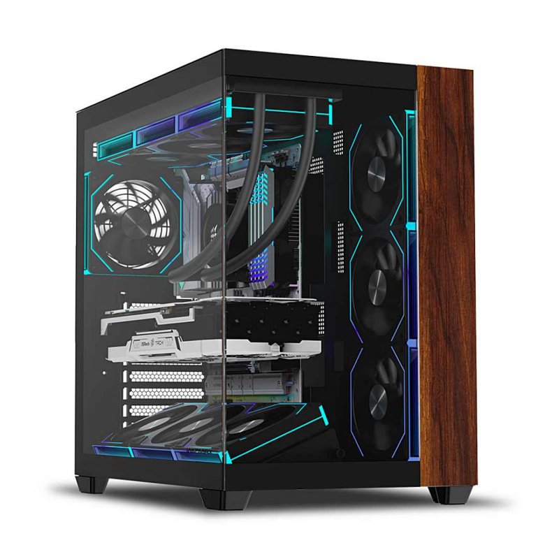 WIZMAX 우드리안 MAX는 천연 월넛 원목 패널과 듀얼 챔버 설계를 적용한 케이스다. 좌측 풀 파노라믹 강화유리 창을 통해 내부 구성을 한눈에 볼 수 있으며, 최대 10개의 냉각 팬, 410mm 길이 그래픽카드, 160mm 공랭 쿨러, 60mm 라디에이터, ATX 메인보드까지 폭넓게 호환된다.