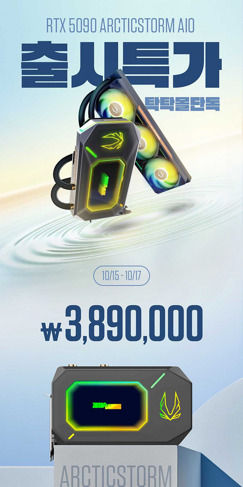 출시 기념 특가전은 10월 15일 오전 11시부터 17일 또는 재고 소진 시까지 조텍 공식몰 탁탁몰에서 진행되며, RTX 5090 ArcticStorm AIO는 3,890,000원에 판매된다.