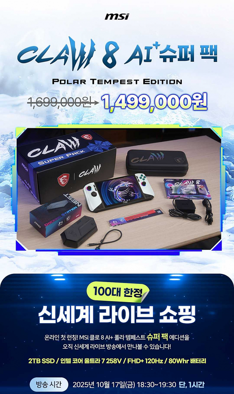 MSI가 10월 17일 오후 6시 30분부터 7시 30분까지 신세계쇼핑 모바일 라이브 방송을 통해 ‘클로 8 AI+ A2VM-U7 폴라 템페스트 에디션 WIN11 슈퍼 팩’을 100대 한정 특가로 판매한다. 본체 가격 1,499,000원에 약 21만 원 상당의 액세서리를 포함한 패키지를 20만 원 할인된 가격으로 제공하며, 방송 종료 후 재입고는 예정되어 있지 않다.