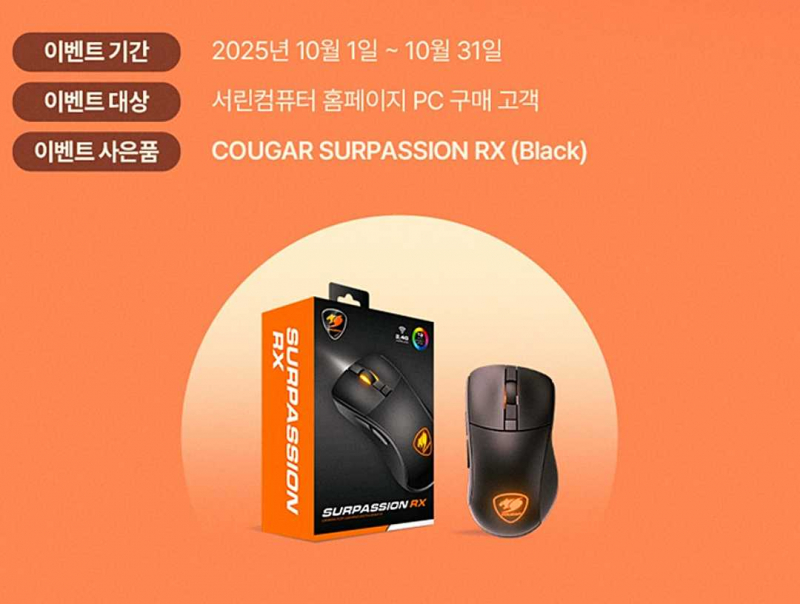 증정되는 무선 마우스는 쿠거 서패션 RX 블랙으로, 2.4GHz 무선과 유선 연결을 모두 지원하는 고응답형 게이밍 모델이다. 손에 안정적으로 맞는 인체공학적 디자인과 정밀 센서를 탑재했으며, 실시간 DPI 조절과 온보드 프로필 저장 기능을 통해 게임과 업무 환경 모두에서 우수한 조작감을 제공한다.