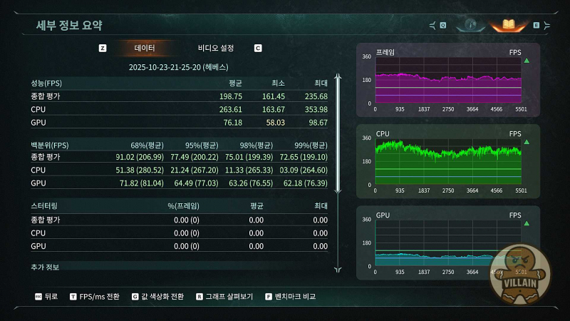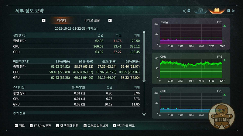 ▲ RTX 5050 DLSS 미적용(TAA) 결과. 평균 62.98프레임으로 FHD 풀옵션에서 평균 60프레임은 일단 넘긴다.