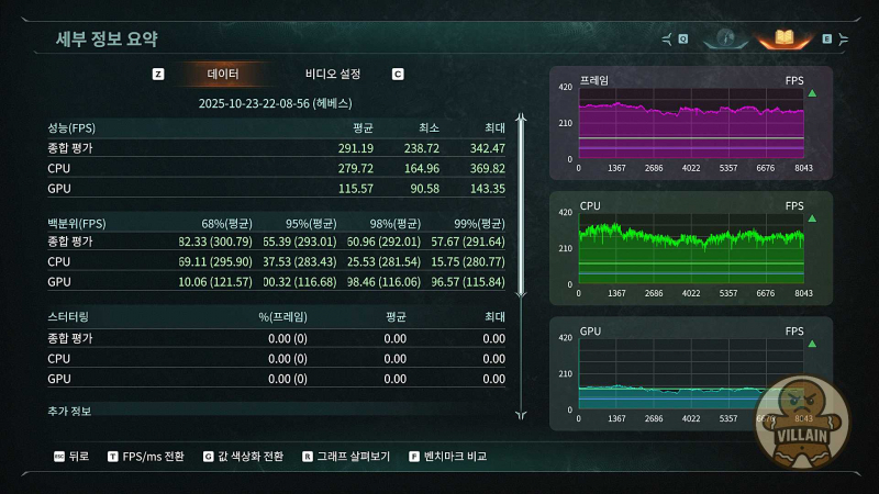 | RTX 5060 Ti | DLSS 품질 + FG 4× | 291.19 | 238.72 | 342.47 | 평균 FPS가 300에 근접 |