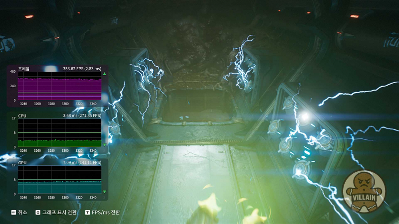 둠: 더 다크 에이지스는 헤베스 구간에서 벤치마크를 진행했다. FHD 해상도에 수직동기화 해제 상태다. 전체 품질 슬라이더는 ‘최악의 악몽’으로 고정했다. 대조군은 업스케일러 옵션을 변경해서 설정. TAA(DLSS 미적용)와 DLSS(품질, 프레임 생성 4x 적용)로 비교했다.